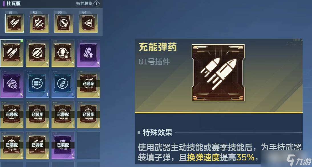 插件选用方面,一号位置建议使用充能弹药,充能弹药的特殊效果是,可以为手持武器自动填充子弹,同时换弹速度可以提升35%,持续时间为五秒。