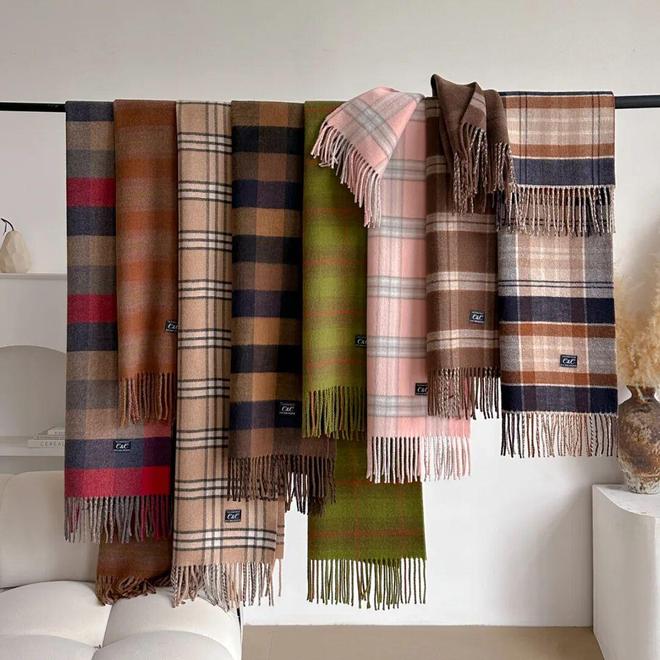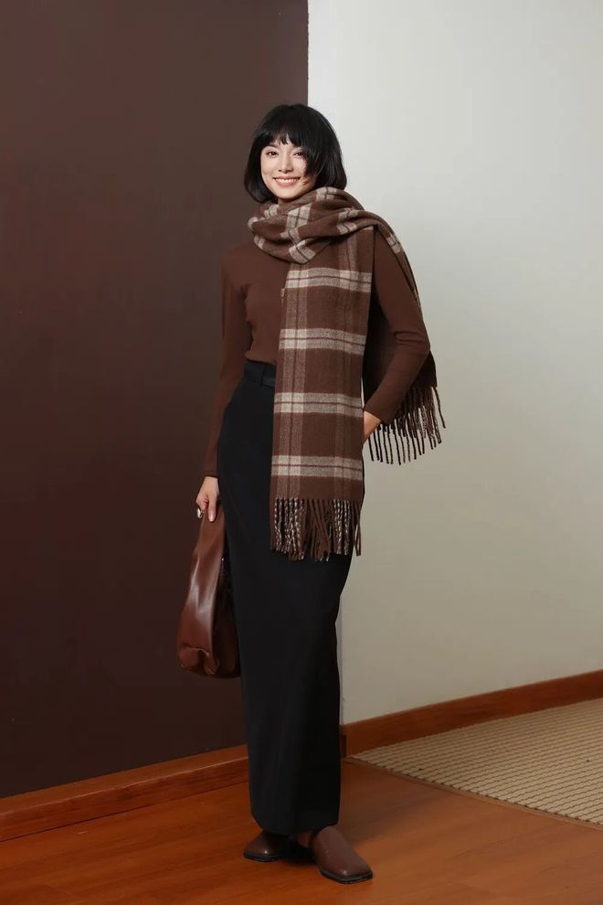 当秋日斜阳掠过肩头,卡其格纹以永恒的低语,在颈间铺开一幅流动的复古诗篇。
