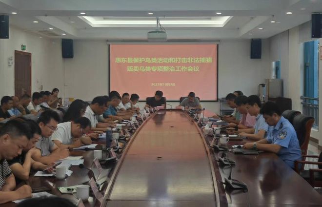 10月7日召开,惠东县全面部署保护鸟类活动和打击非法捕猎贩卖鸟类专项整治工作,指出鸟类是生态系统的重要组成部分,保护鸟类是贯彻落实习生态文明思想的具体行动,全县上下将以更高站位、更强担当、更实举措,全面加强鸟类栖息地保护,严厉打击非法捕猎、贩卖鸟类等违法行为。一是立即开展全域排查整治。组织镇、村干部及护林员队伍,对山林、果园、菜园等重点区域开展“清网清套清夹”常态化巡查,做到发现一处、清理一处、查处一处。二是强化宣传引导与公众参与。通过多种形式普及鸟类保护知识及相关法律法规,探索建立举报奖励机制,鼓励群众积极参与野生动物保护。三是依法从严打击非法行为。对排查发现的非法捕猎线索,由县公安局森林警察大队与县林业局联合执法,依法从严查处,构成犯罪的坚决追究刑事责任,形成“发现即查、露头就打”的高压态势。四是严格督导问效。由县林长办牵头,以“四不两直”方式开展明查暗访,对工作落实不力的单位及时通报整改,确保部署落地见效。
