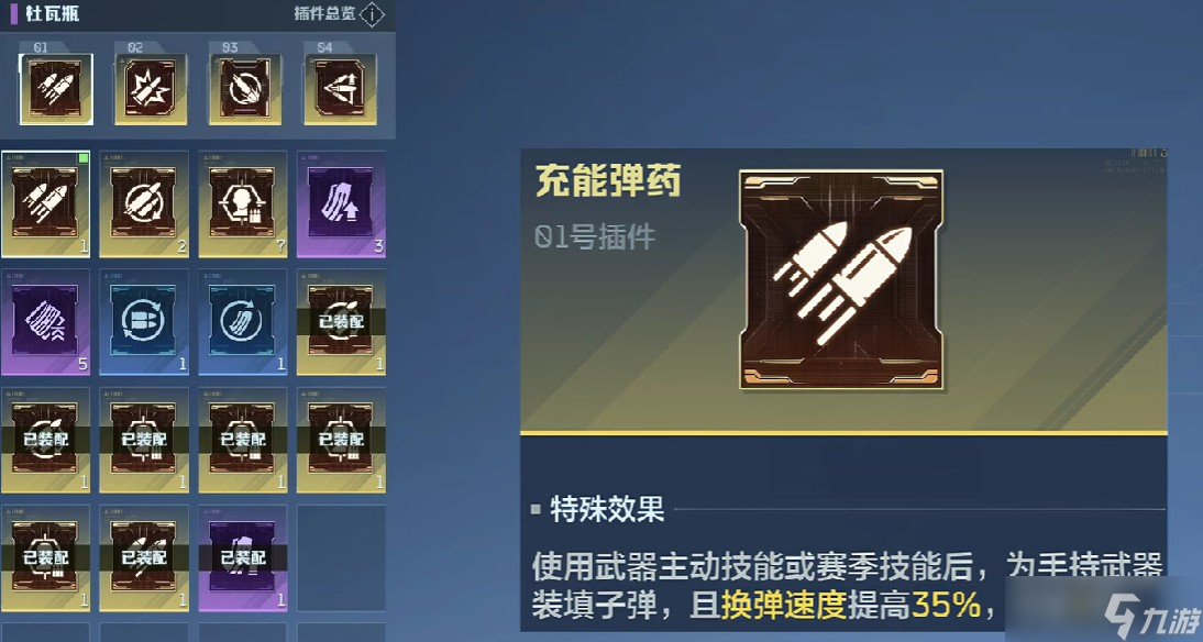 杜瓦瓶的插件选用方面,一号位置建议使用充能弹药,充能弹药的特殊效果是,可以为手持武器自动填充子弹,同时换弹速度可以提升35%,持续时间为五秒。