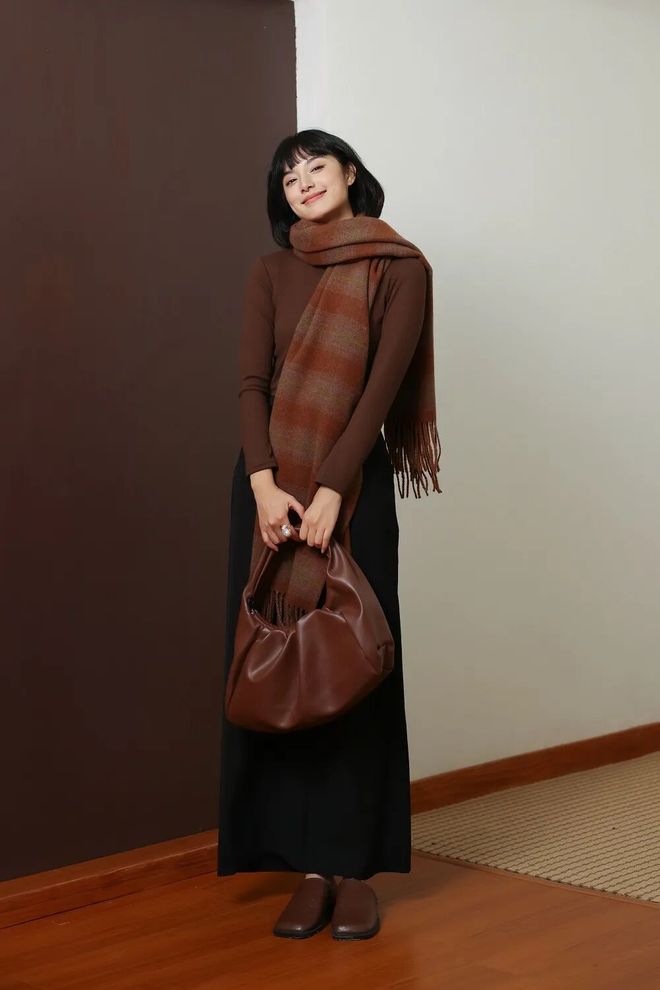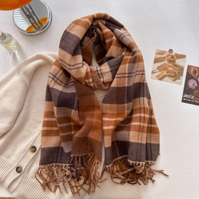 当秋日斜阳掠过肩头,卡其格纹以永恒的低语,在颈间铺开一幅流动的复古诗篇。